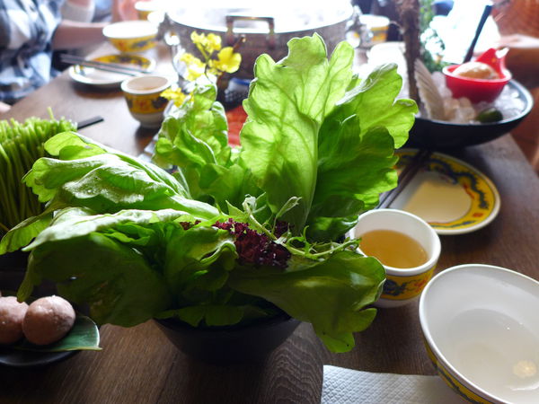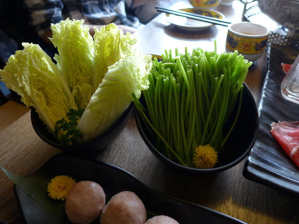 不撕開,茼蒿就是這樣一整把涮下去,等葉子轉成翠綠色就馬上夾起