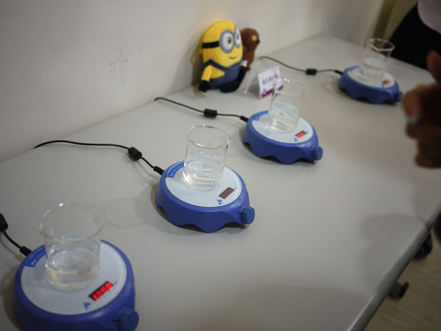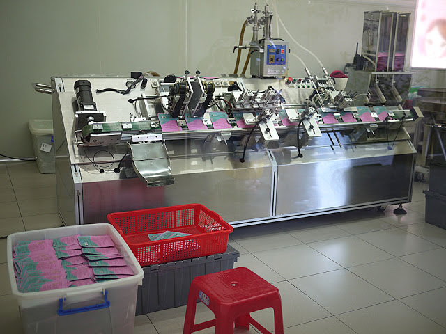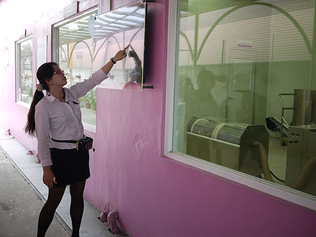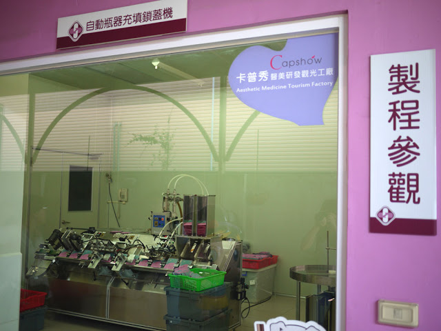 右側的粉紫牆壁中,有不少的透明窗戶,裡面展示了各種保養品的製作過程,例如眼前所看見的是面膜,平常都有正常營運,機器是會運轉的!