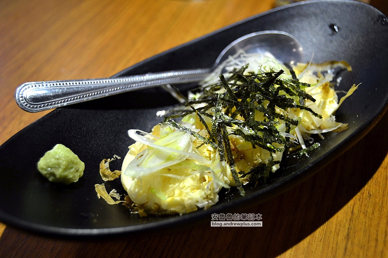 算是冷盤,將豆腐與起司充分混合,上層舖上海苔.蔥白.柴魚增加風味,吃起來口感滑順,可再依個人喜好沾取芥末醬及其它醬料