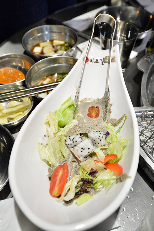 美生菜、小番茄、火龍果、紅捲、綠捲鬚等生菜與芝麻醬的沙拉,味道一般。