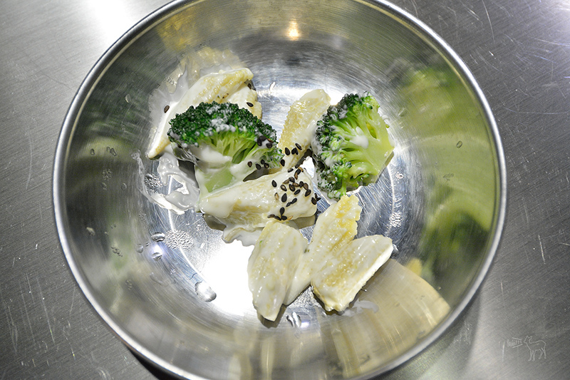 另一沙拉是花椰菜與玉米筍川燙後涼拌沙拉醬,是說那沙拉醬吃起來讓我有種廉價台式袋裝沙拉醬的錯覺,比較甜膩。
