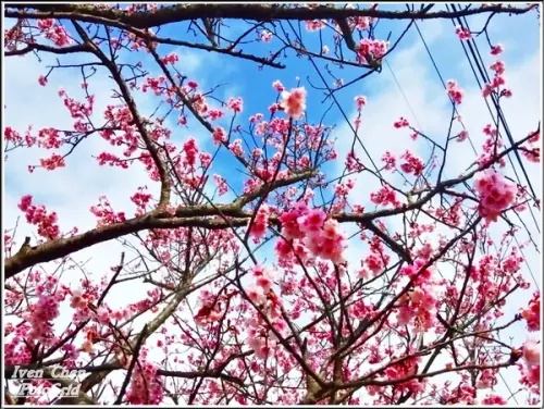 一大堆粉紅櫻花藏在綠綠的裡面,怎麼這麼開心。