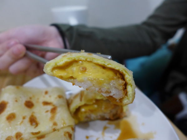 滿滿一口同時吃到外酥內軟的蛋餅皮、薯餅、半流動狀起司,