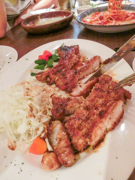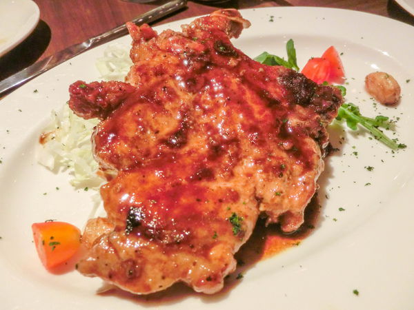 這個豬排也是今晚的一品,肉夠厚但吃起來卻能保持軟嫩中但點脆感,搭配偏甜的醬汁