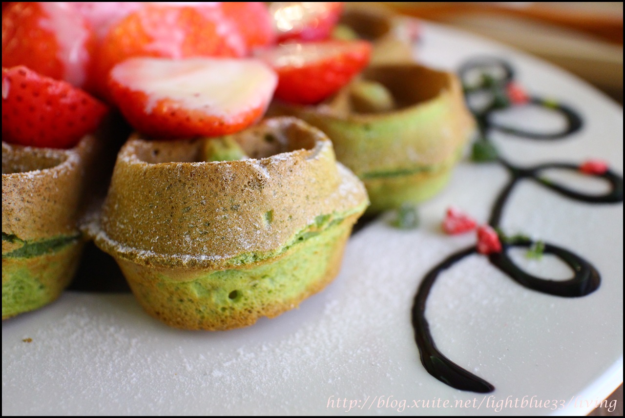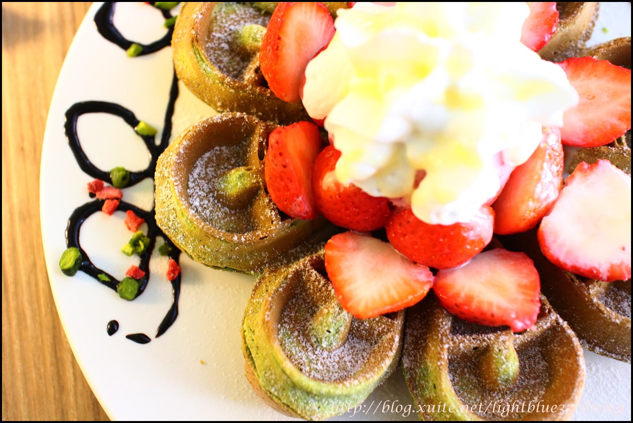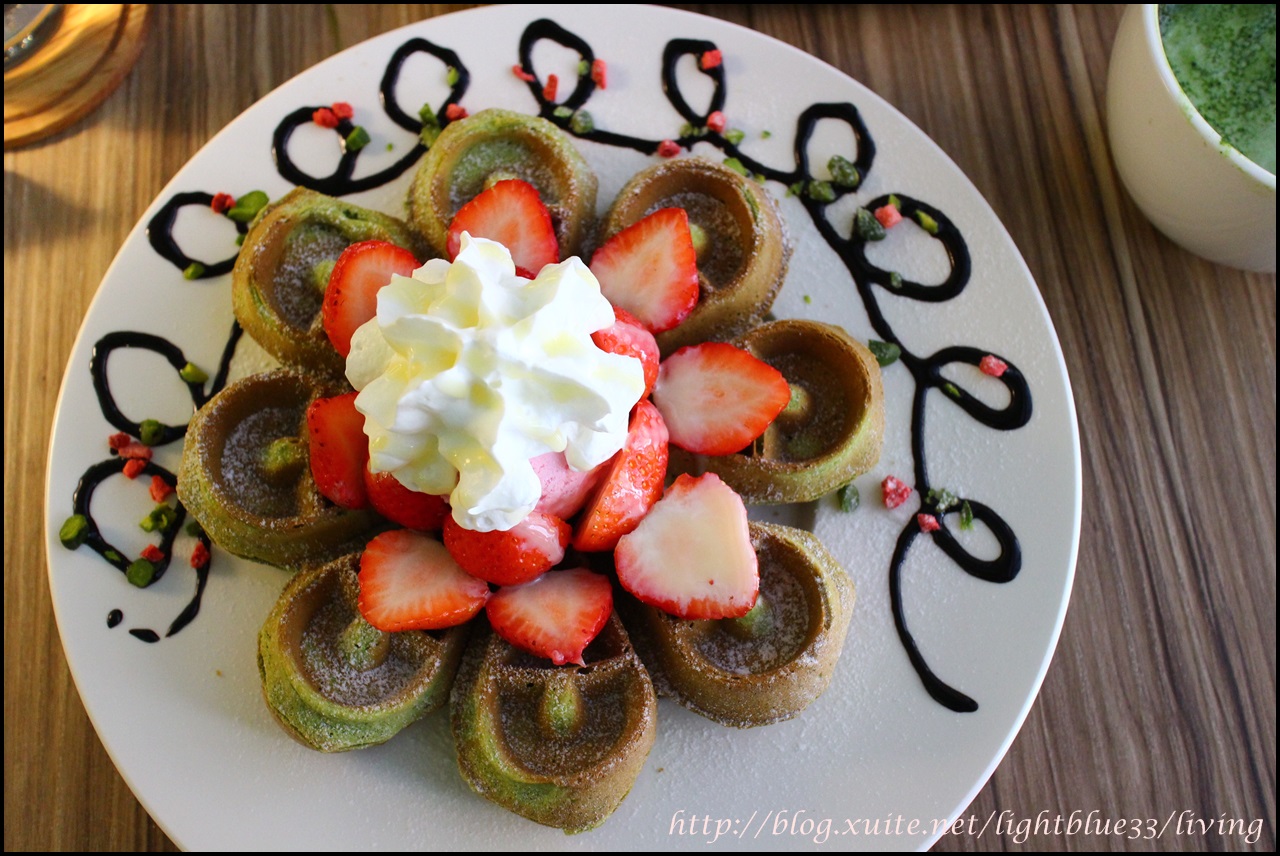 這鬆餅是不是像花一樣繽紛漂亮!綠色的抹茶花瓣鬆餅上頭有一大球草莓冰淇淋,旁邊還擺滿了新鮮草莓切片,並擠上了白色鮮奶油,盤子上還畫了巧克力醬裝飾