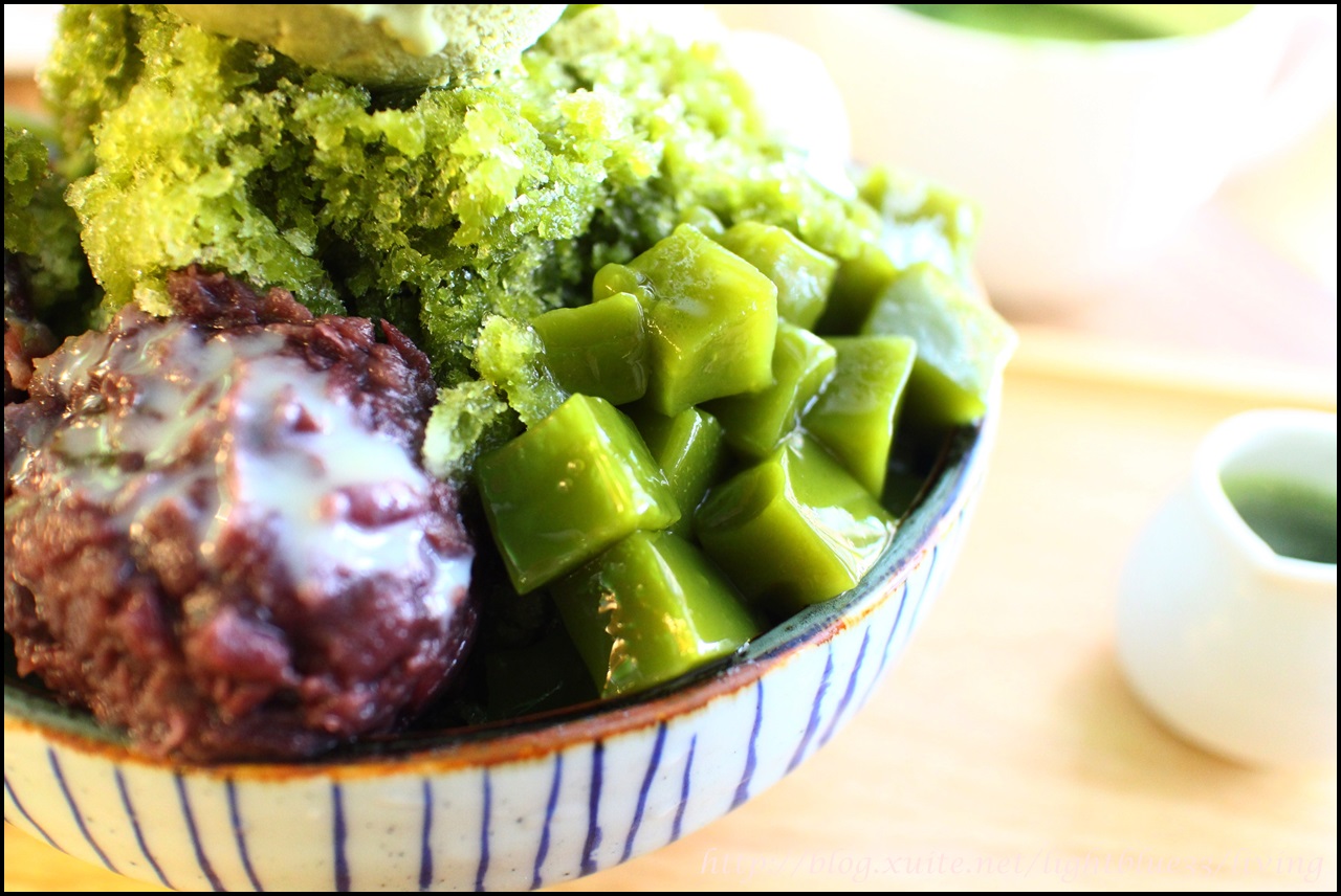 刨冰被抹茶浸透,呈現迷人的碧綠,但是顆粒並不會太粗,含在口中一會兒就會融化,刨冰本身也是沒有多淋糖漿或煉乳,煉乳是淋在紅豆泥上頭的,所以可以自己調整甜度,無糖的抹茶刨冰搭配微甜的紅豆泥,兩者便有自然的協調,紅豆泥在泥狀中又帶一點顆粒感,所以略有咀嚼口感,也讓豆香味更濃郁