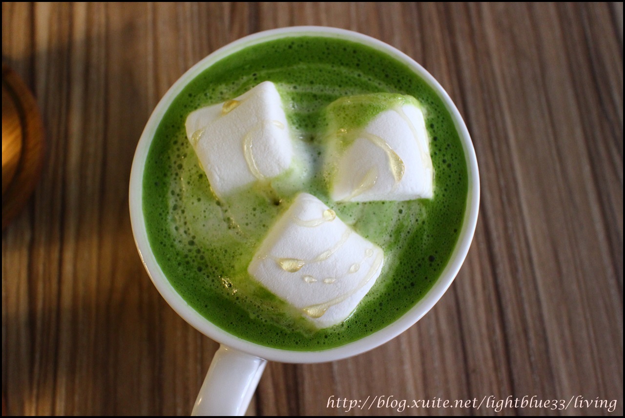 因為很好奇所以點的「抹茶雲朵拿鐵」,上桌後才明白原來雲朵指的就是棉花糖啊,淋醬可以選擇,我們選了蜂蜜。基本上抹茶拿鐵是無糖的,所以儘管棉花糖很甜,但是吃完棉花糖後喝一口抹茶拿鐵就還是均衡的,而且棉花糖下緣會因為抹茶拿鐵的熱度而微微融化,口感頗為有趣。