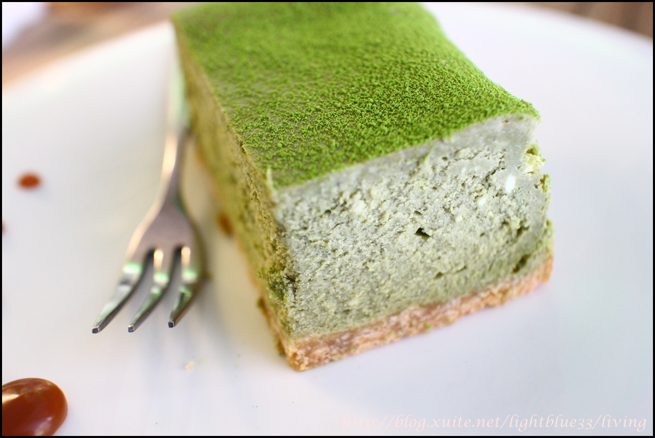 加價90元點的抹茶乳酪蛋糕,(原價180元)本來是想點菜單上看來很厲害的抹茶巧克力塔,不過服務生說前一天開幕賣光了,當天還來不及作,可能要晚點,後來我們離開時有看到抹茶巧克力塔脫模,也看到隔壁點的藍莓起司很好吃的樣子,但是已經吃不下了,只好等下次再戰。