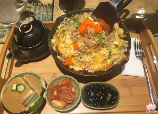 雖然Y笨很習慣西式起士的早午餐,但難得在台南早午餐店裡找到日式廣島燒,當然要嚐鮮。配菜黑豆/土瓶蒸/泡菜/ 冷盤芝麻醬豆腐也不馬虎! 一切開,就有滿滿的炒麵還有滿多片的培根,完全的融合在起士裡卻不會膩。而土瓶蒸裡也有滿滿的雞肉/香菇和蛤蜊熬入味的頭,推!