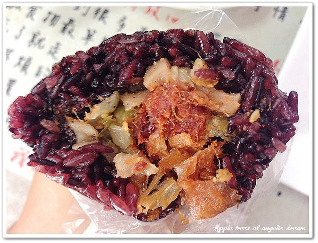 他們家的紫米飯糰個頭也算大吃起來口感蠻Q的,軟硬適中不會太黏粒粒分明