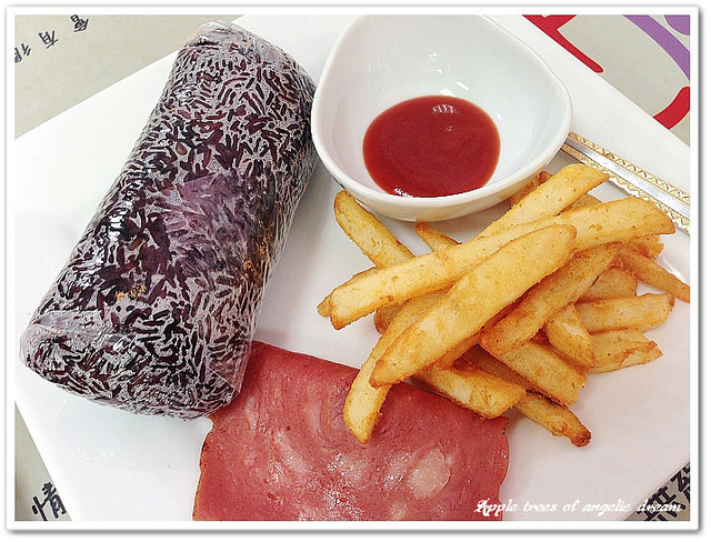 套餐的主角放在紫米飯糰跟紫米漿上面,至於薯條就一般然後火腿有點乾XD