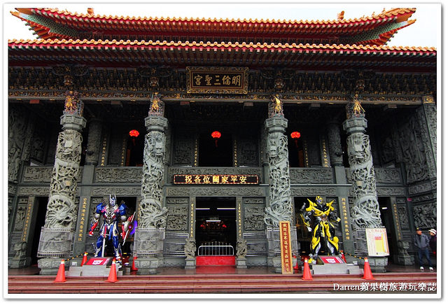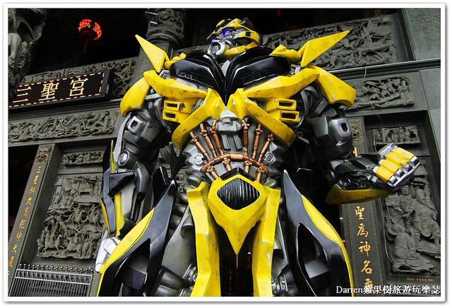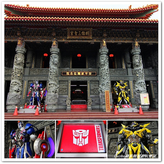 三聖明倫宮是桃園在地的信仰中心之一主祀奉關聖帝君,兩尊變型金剛就在廟門前非常亮眼