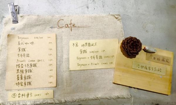 半寓的整個空間讓人有很隨心所欲的感覺,當我踏進半寓時還有點半信半疑這真的是一家咖啡店嗎?感覺也滿像純粹的人文空間,一個文藝展覽空間之類的,因為吧台不見任何店員的芳蹤。後來突然有名(我以為是客人的)姊姊從長桌站起來請我隨意找個位子坐我才確定XD 也發現這位姊姊其實就是老闆,校長兼撞鐘,獨自顧半寓咖啡