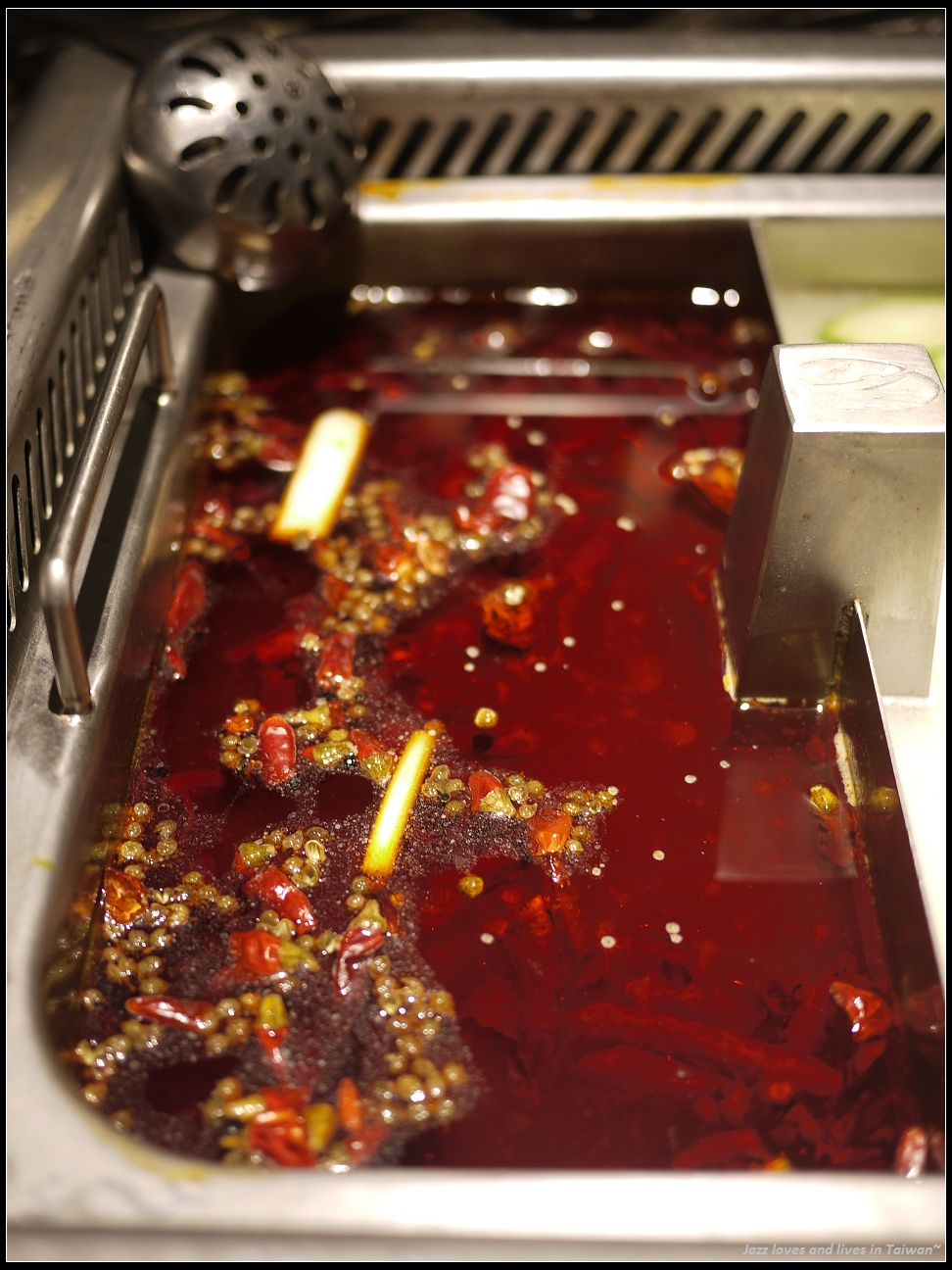 上鍋啦! 海底撈的鍋面設計是與桌面略低一點點, 看起來略低的的設計是為了鍋子四周有個排煙的設備, 有點像是有些烤肉店的排煙設計,