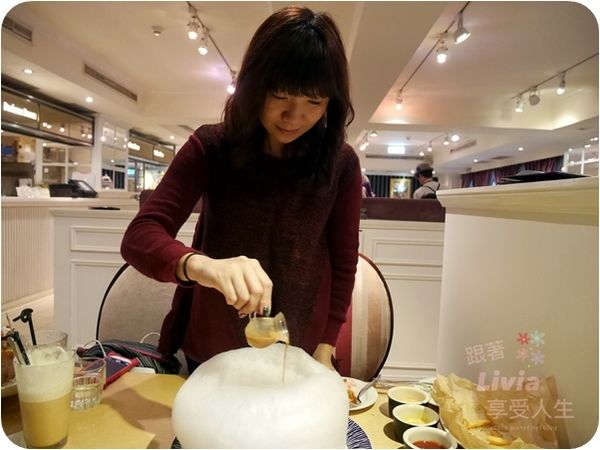 以畫圓的方式慢慢的在雲朵上淋上嫌焦糖牛奶,驚喜就在這時出現囉!