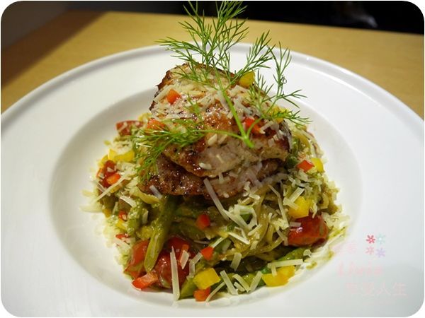 貼心的幫我們先上桌鹹食,羅勒青醬燻雞義大利麵,青醬味道非常濃郁,