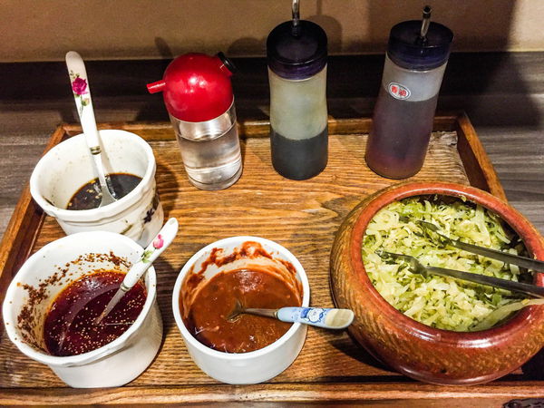 調味料還蠻豐富的,上排四種是吃水餃或喝湯用的,辣椒也有兩種選擇,旁邊的榨菜走清爽類型,