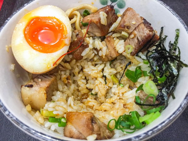 叉燒塊跟麻辣沾汁內的一樣,數量不少但味道偏淡而且都有過熟的問題;下頭的白飯也沒甚麼醬汁,