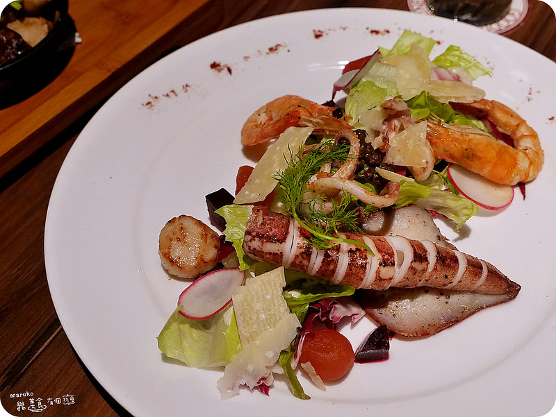 擺盤非常漂亮的海鮮沙拉除了時令的花枝、鮮蝦、干貝等等,加入了生菜、刨刀起司片再淋上了凱薩醬