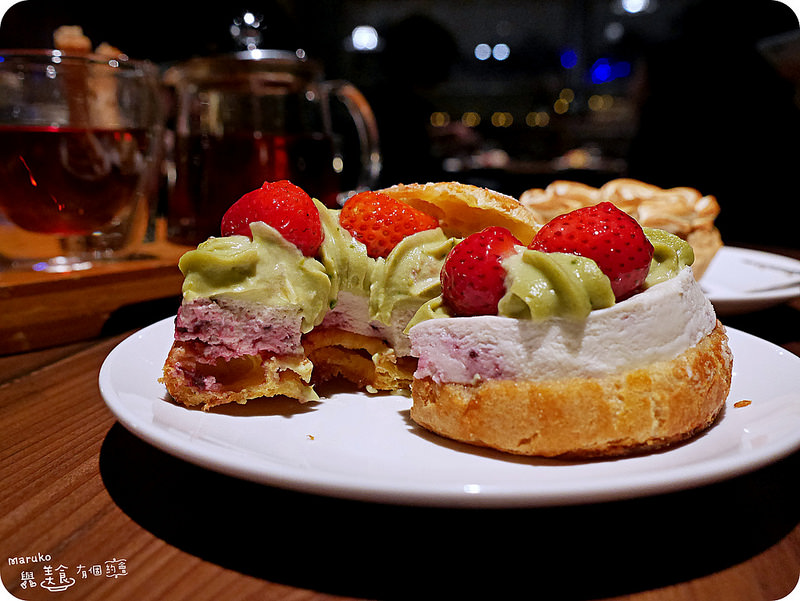 San自己選了一款甜點,是軟式的泡芙搭配上微酸的莓果慕斯和開心果醬還有他最愛的草莓,開心果醬比
