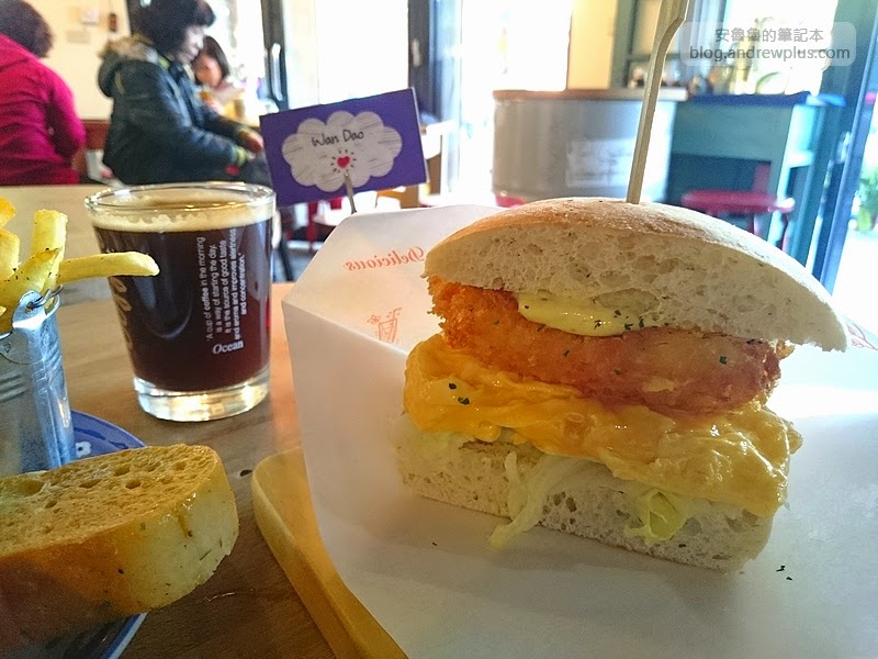 來說說食物,我點的是台式Tartare香草檸檬炸魚佛卡夏,還有法國萊因雙火腿~我喜歡漢堡,而塔塔醬炸魚很清爽,不像一般漢堡吃起來較鹹味道偏重,炸魚加上香草檸檬塔塔醬,然後還有軟嫩的歐姆蛋,還有酥脆可口的佛卡夏,一整個就是清新FU啊~