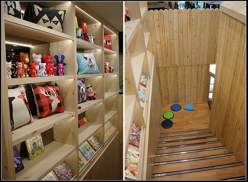 2樓有一塊靜態的扮家家酒區,使用的全都是木質的廚房家具,旁邊則有一些建構積木版,牆上展示區有繪本可以讀。