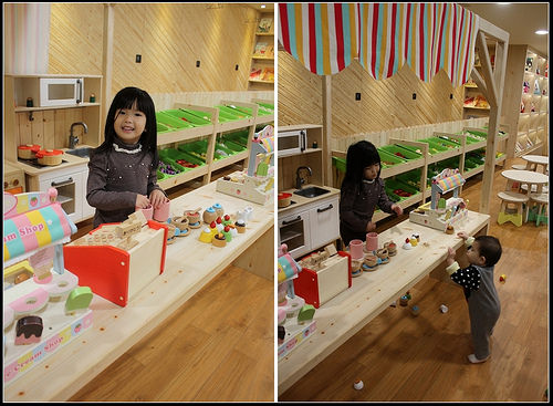 意外的是今天小魚兒很買單這裡的遊戲區,大多時間都在這邊和姊姊一起玩扮家家酒~