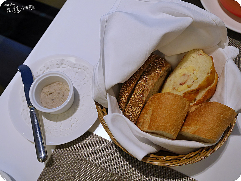 麵包籃依當日麵包種類搭配了三種麵包,固定的雜糧核桃芝麻麵包、法國麵包,另外搭配了起司培根麵