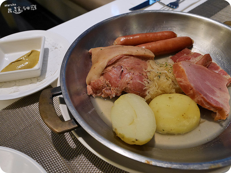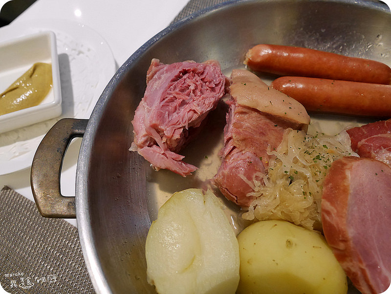 這個使用大量蔬菜燉煮的經典菜色阿爾薩斯酸菜豬腳還搭配了德國香腸、豬肉、厚培根、黃皮洋芋,