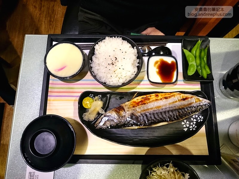 | 鹽烤鯖魚 - 除了主菜,小菜都是一樣的! 白飯一碗,奶酪,毛豆,味增湯,茶碗蒸~每個套餐都有 |