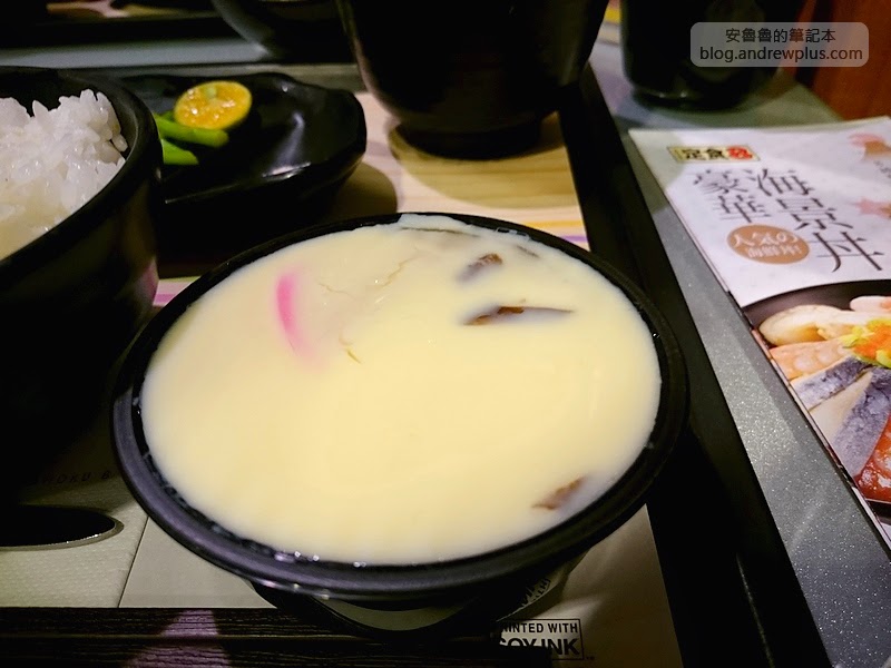 | 自助區有熱茶,拌飯醬,和風沙拉醬,還有海帶芽可以加,味增湯,高麗菜絲,白飯可以吃到飽!~ |