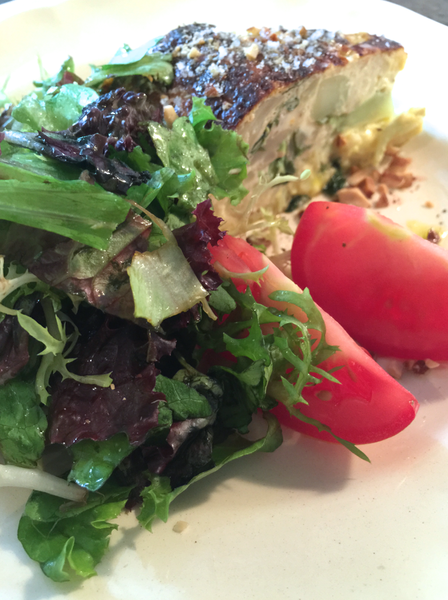 上面則是 有杏仁碎片 海鹽 起司 簡單提味 外層微微焦酥香味 吃起來 有層次且細膩 海鹽陪襯的剛剛好 鹹香 不過於搶掉烘蛋的原味 搭配溫沙拉跟新鮮番茄 是道非常有厚度的料理 然後別小看小小一片 飽足感很夠喔~~