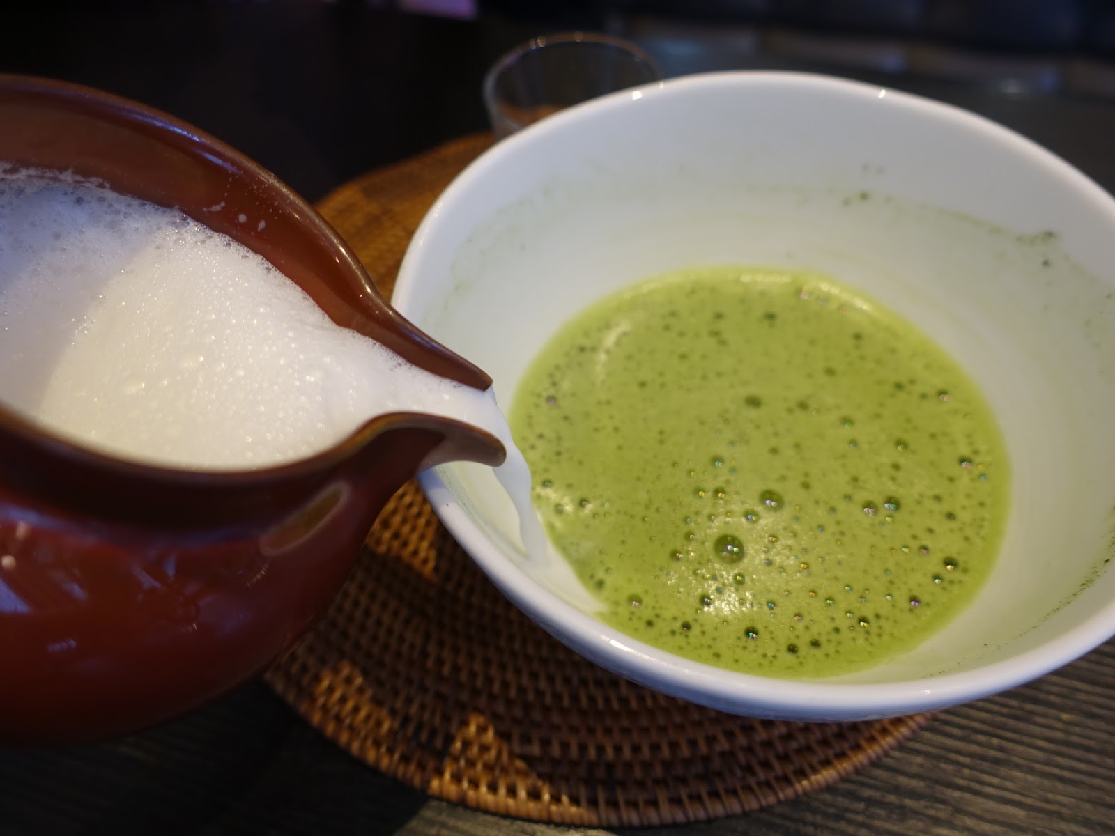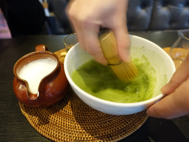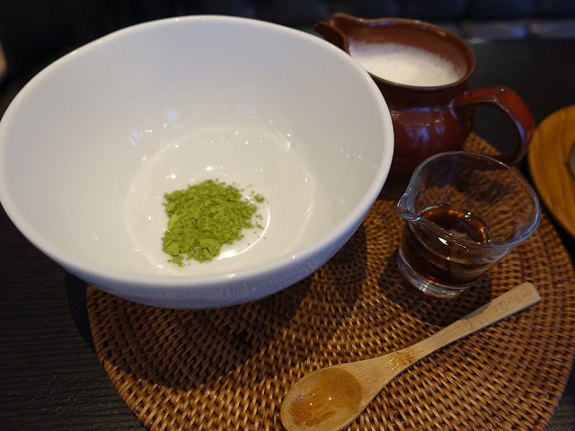抹茶拿鐵一送上來,服務員就立刻為我們手打,將空氣快速打進抹茶裡,手法相當迅速,打出來的抹茶真的就跟日本喝到的一模一樣,之後再自己酌量添加熱牛奶,也可依照自己口味加入糖漿,茶味濃厚的熱抹茶有些苦澀,加入熱牛奶後比較順口些。