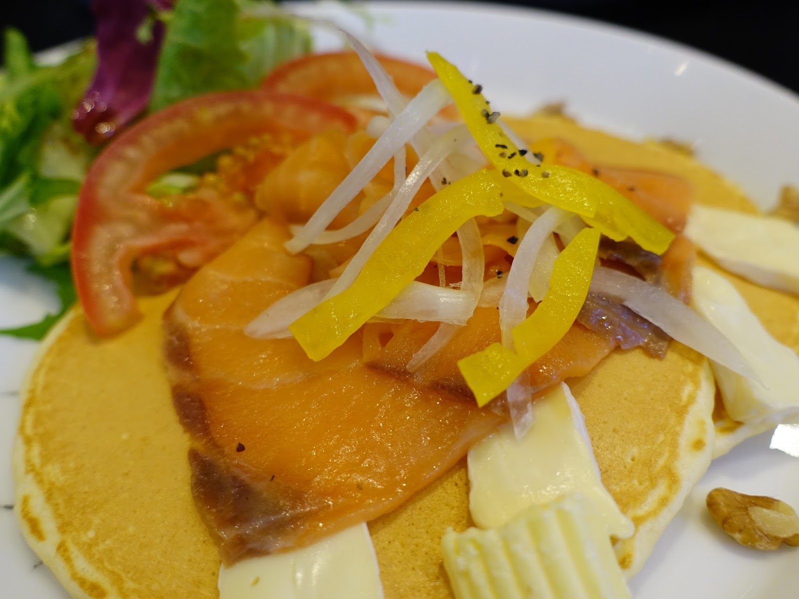 燻鮭魚卡門貝爾起司鬆餅的鮭魚並不是冰冷的,這點我相當肯定,底下的鬆餅很像是自家手作的,在鬆餅上把鹹奶油抹開,配著口味不重的燻鮭魚,相當好吃!仔細看白色的平滑薄片是柔軟的卡門貝爾起司,平心而論材料用得很不錯!