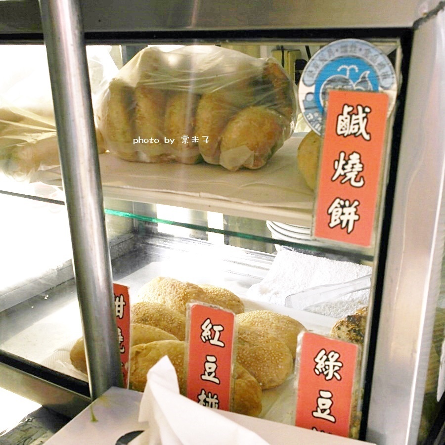攤位上的小玻璃櫃放了許多甜、鹹燒餅和紅豆碰、綠豆椪,