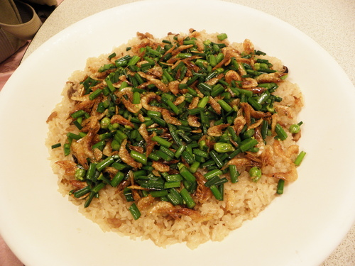 Q彈的米糕上面鋪著滿滿的櫻花蝦及韭菜花