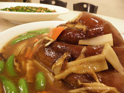 裡面摻了髮菜、筍絲、紅蘿蔔絲、白菜、香菇、金針菇、蟹肉、蝦仁、魚翅等配料