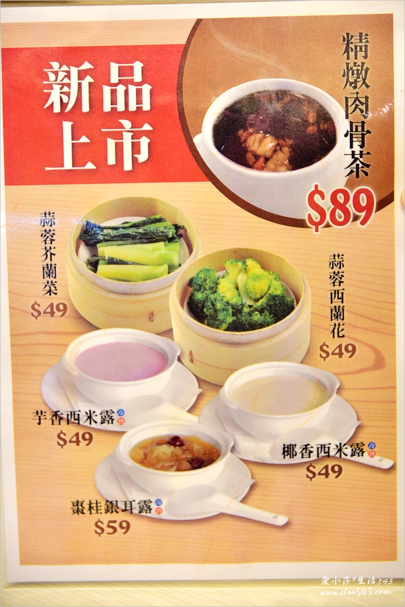 菜單上圖文並茂秀著店裡各式菜色,有港點蒸品、煎品、粥品、炸品、甜品及燉湯,