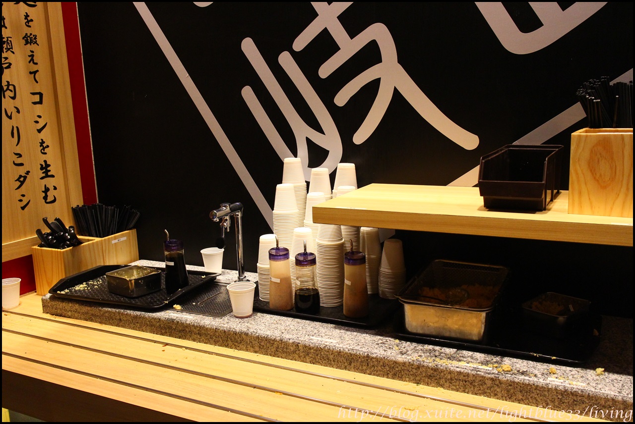 出口處是餐具區跟醬料區,還有開水可以自己取用,小鐵盒裡是生薑末,大盒子是炸的碎麵衣可以自取,可以跟烏龍麵的彈性形成對比,讓口感更豐富