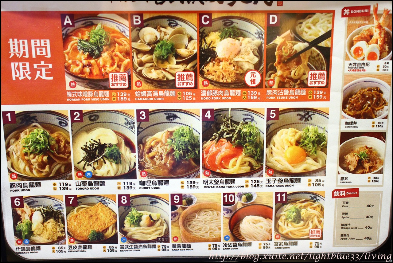 店家也很聰明地在排隊的紅龍上貼了菜單,這樣就可以一邊排隊一邊研究要吃什麼。期間限定有四種,非常吸引人,最便宜才105元,是不是很感人!常備的烏龍麵也有11種選擇,非常豐富,竟然最低75元就吃得到,省下的餐費又可以讓血拼額度再多一點點呢