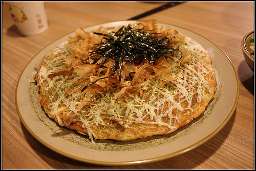 豆腐麻糬燒(NT100),這也是老闆精心研發出來的獨特菜單,上桌跳舞的柴魚片讓孩子們看得很高興!