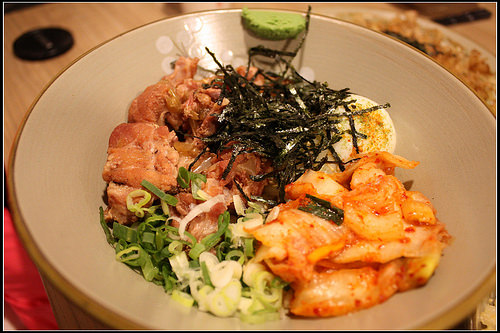 溫泉蛋的蛋黃半生不熟,滑滑嫩嫩地,跟麵條拌開搭配泡菜、豬軟骨和溫泉蛋吃進嘴裡,是很豐富充實的口感。