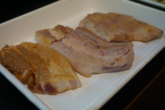 三種豬肉(由左至右為韓國水梨醃豬五花、豬五花、豬松坂。)