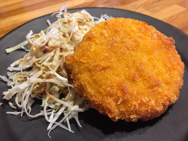 淋上胡麻醬的高麗菜絲吃來清爽,起司芝心的可樂餅色澤炸得漂亮,沒另外沾醬但軟呼呼的口感