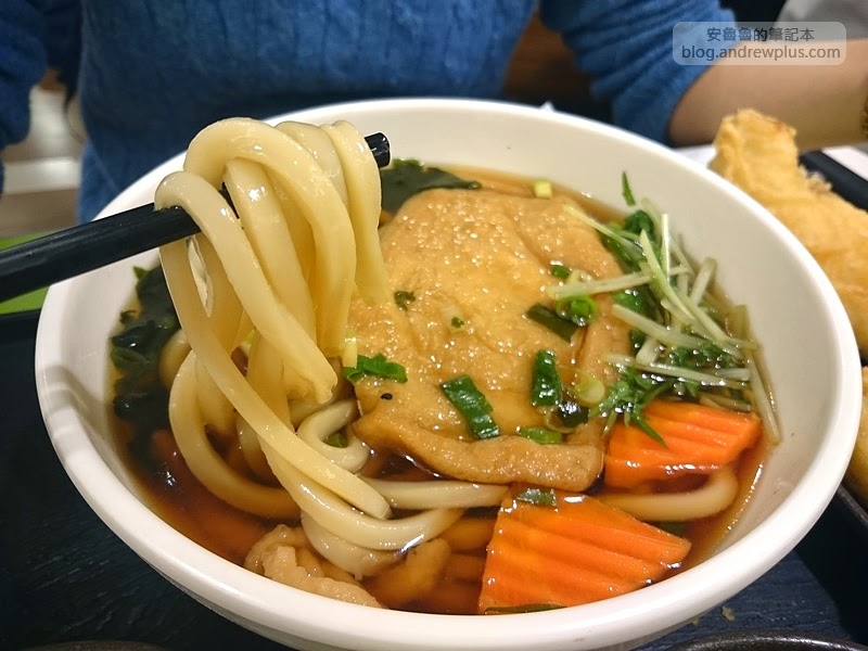 大和豆皮烏龍麵是湯麵,他的湯是屬於醬油鹹味的湯,但是味道偏輕淡,我想店家的用意就是不要去搶主角烏龍麵的味道,所以才會這樣設定。豆皮咬起來還滿Q的~而且還滿大一片的,搭配其他的蔬菜如胡蘿蔔,小豆苗,海帶...光吃完這一碗麵就真的很飽了,更何況還有其他炸物還沒解決。