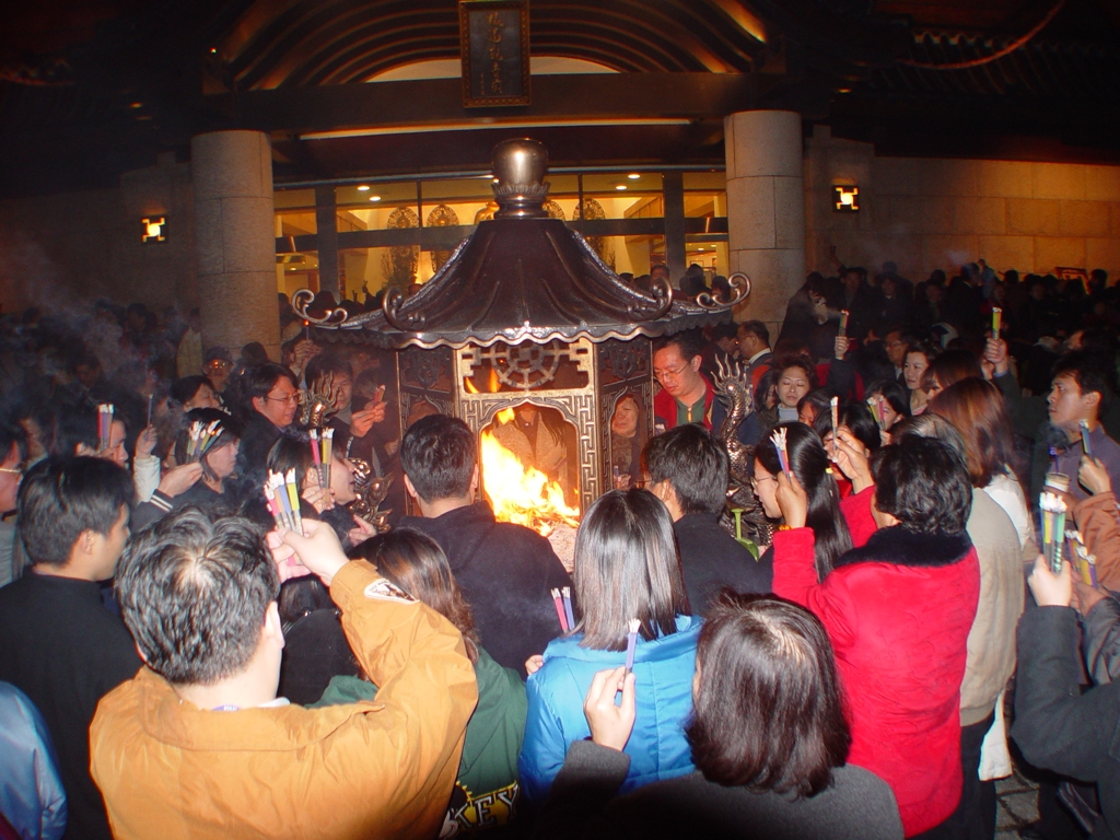 跨年倒數後,佛乘宗第三代宗師善單帶領民眾向 大自在王佛暨四大菩薩以及 緣道祖師菩薩上香祈福,之後敲響「佛乘妙音法鐘」十聲為現場民眾及其親友,以及全世界祈福!