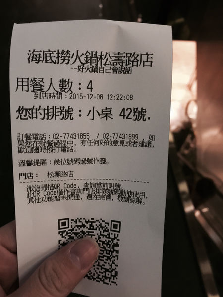 當時服務員上告訴我約1-2小時可以輪到,隨時可以掃描號碼單上的QR CODE看看到幾號了