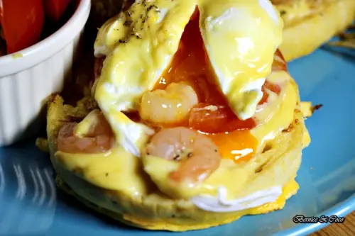 爆漿水波蛋底下還躲了彈牙蝦仁,底下則舖了相對有嚼勁的馬芬麵包。