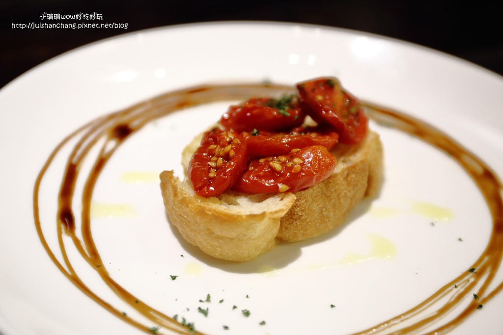 番茄用香料及橄欖油以烤箱低溫慢烤,烤到番茄皺皺枯萎的狀態,吃起來酸酸甜甜的很像酸梅,鋪在烤麵包片上當開胃菜