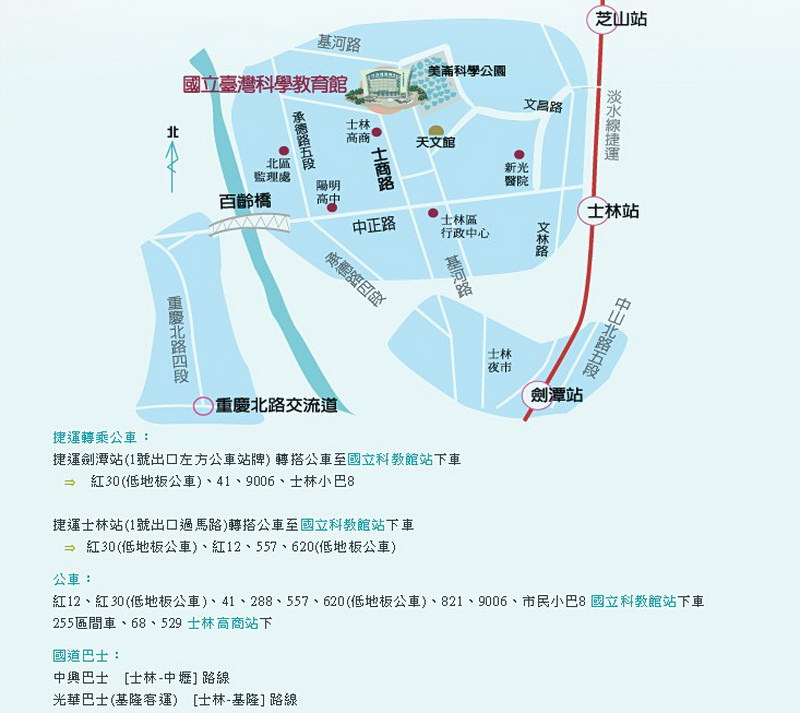 到士林科教館,可以選擇搭乘捷運至劍潭站轉xx號公車直接在士林科教館下車,